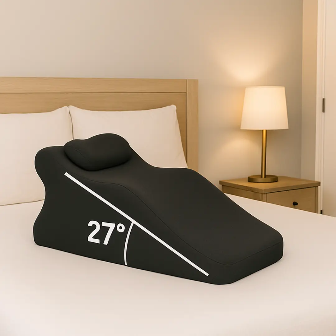 •Ergonomisk design: En exakt 27° lutning håller kroppen i optimalt läge — ingen sjunkande eller glidande kudde som stör stunden.